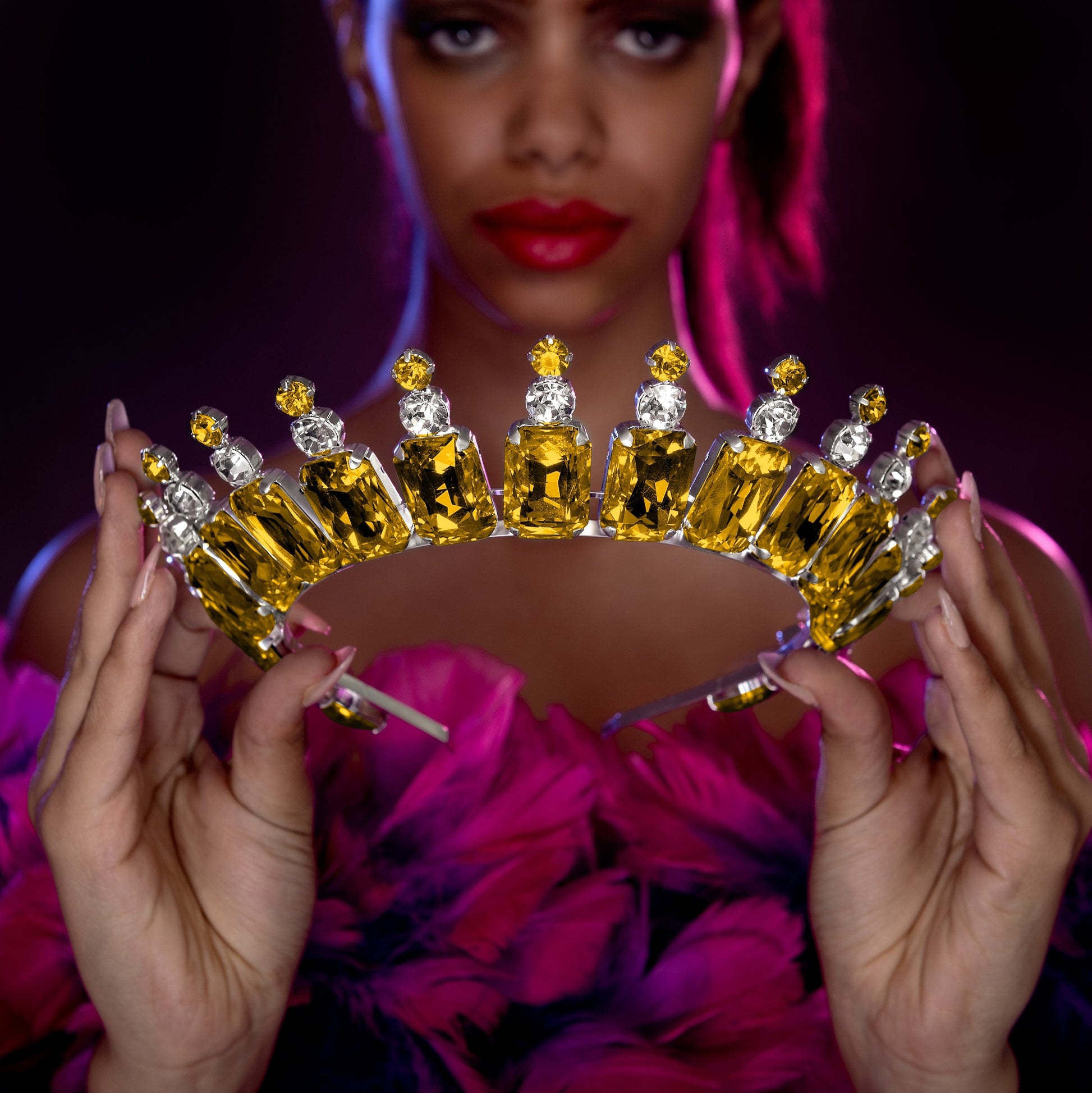 Resplendent and regal, this striking golden yellow colour tiara is an absolute masterpiece, handset faceted emerald cut crystals adorn the headline for ultimate glamour.